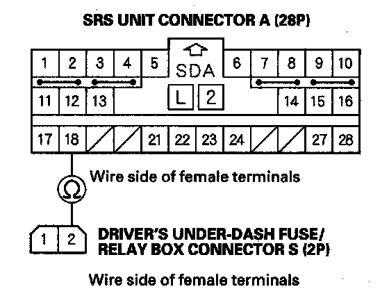 18. Measure the resistance between the No. 2 terminal of driver's under-dash fuse/relay box connector S (2P) and the No. 18 terminal of SRS unit connector A (28P). There should be 0-1.0 ohm.
