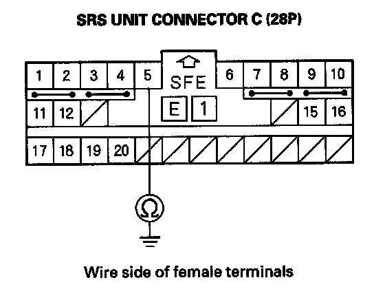 6. Measure the resistance between the No. 5 terminal of SRS unit connector C (28P) and body ground. There should be an open circuit or at least 1 Mohms.