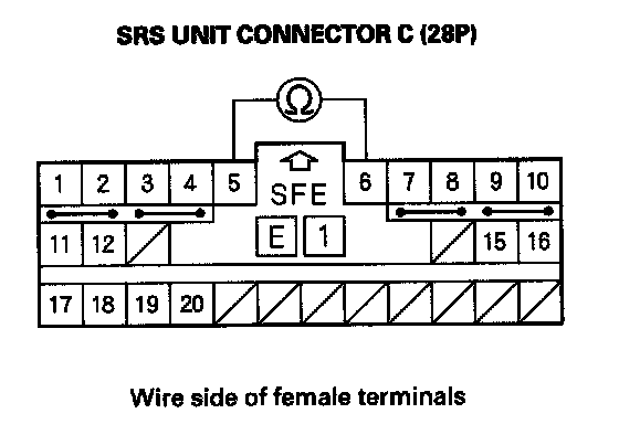 7. Measure the resistance between the No. 5 and No. 6 terminals of SRS unit connector C (28P). There should be an open circuit or at least 1 Mohms.
