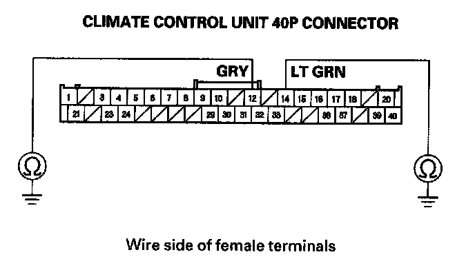 8. Check for continuity between body ground and the climate control unit 40P connector No. 12 and No. 14 terminals individually.