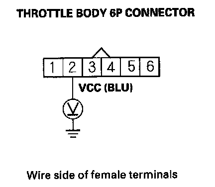 11. Measure voltage between throttle body 6P connector terminal No. 2 and body ground.