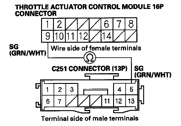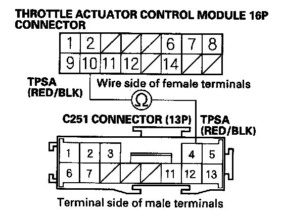 12. Check for continuity between throttle actuator control module 16P connector terminal No. 10 and C251 connector (13P) terminal No. 4.