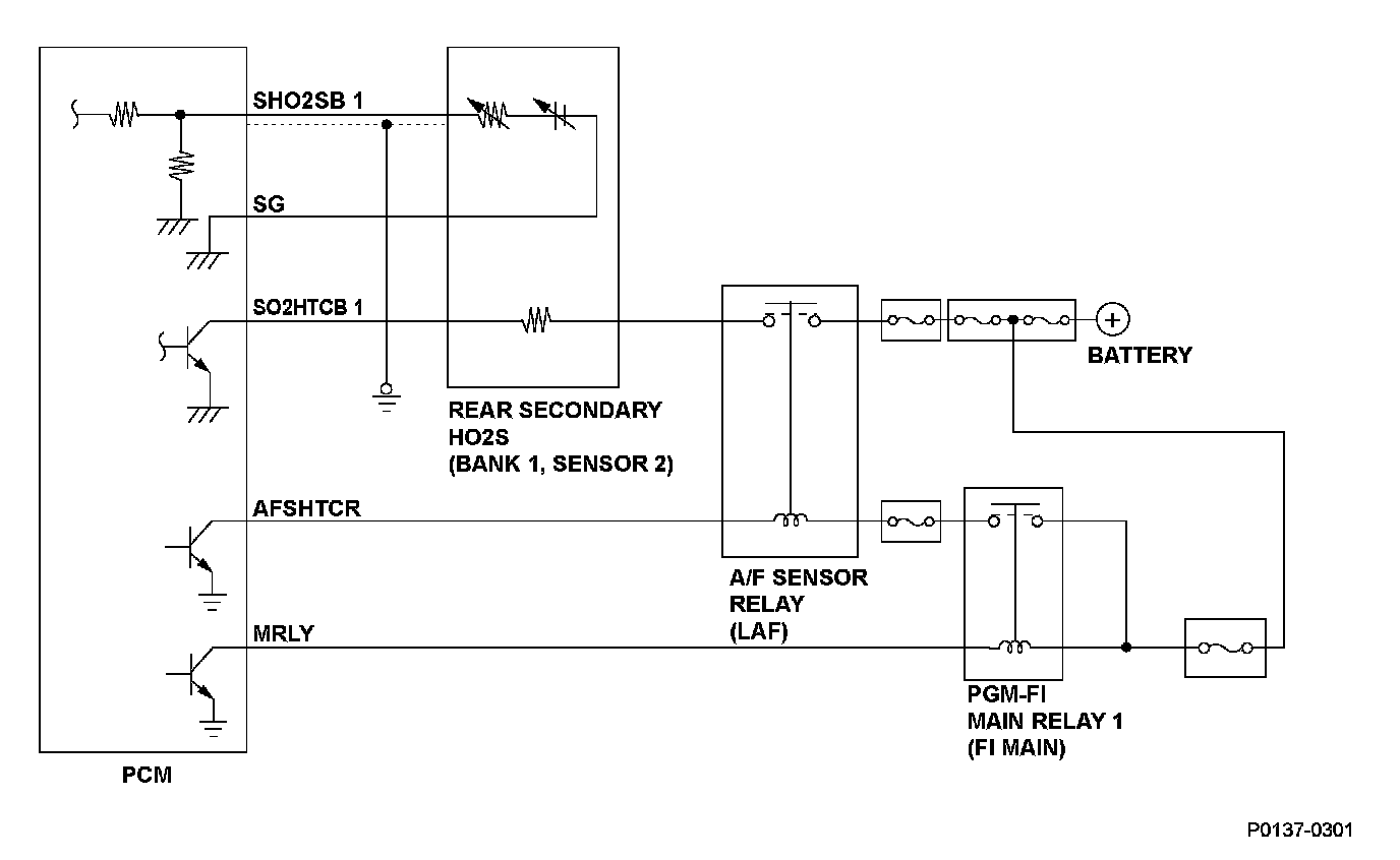 A heater for the zirconia element is embedded in the rear secondary heated oxygen sensor (rear secondary HO2S) (bank 1, sensor 2), and it is controlled by the powertrain control module (PCM). When activated, it heats the sensor to stabilize and speed up the detection of oxygen content when the exhaust gas temperature is cold.