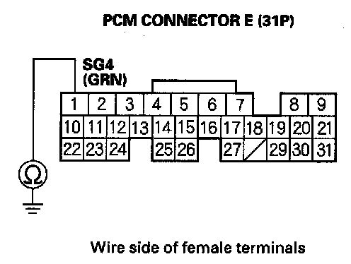 20. Check for continuity between PCM connector terminal E1 and body ground.