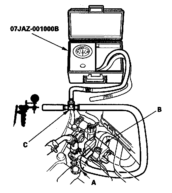 6. Disconnect the vacuum hose (A) from the EVAP canister purge valve joint (B) in the engine compartment, and connect a T-fitting (C) from the vacuum gauge and the vacuum pump/gauge, 0 - 30 in.Hg, to the hose as shown.