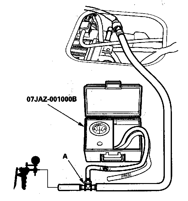 12. Disconnect the vacuum hose from the PCS line (at the EVAP canister side), and connect a T-fitting (A) from the vacuum gauge and the vacuum pump/gauge, 0 - 30 in.Hg, to the hose as shown.