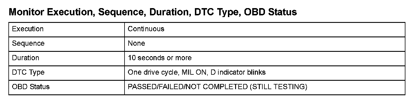 Monitor Execution, Sequence, Duration, DTC Type, OBD Status