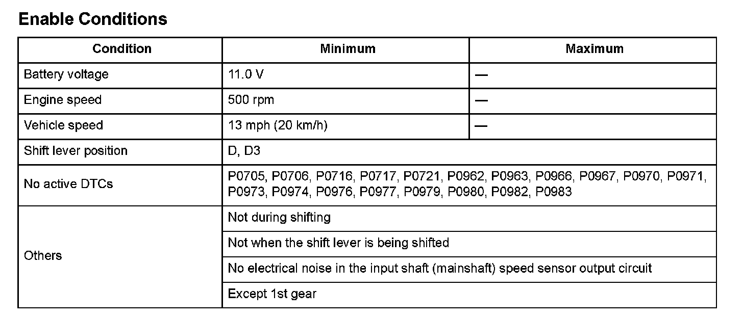 When the vehicle speed measured by the input shaft (mainshaft) speed sensor is 13 mph (20 km/h) or more, the vehicle speed measured by the output shaft (countershaft) speed sensor is 1 mph (2 km/h) or less for at least 10 seconds.