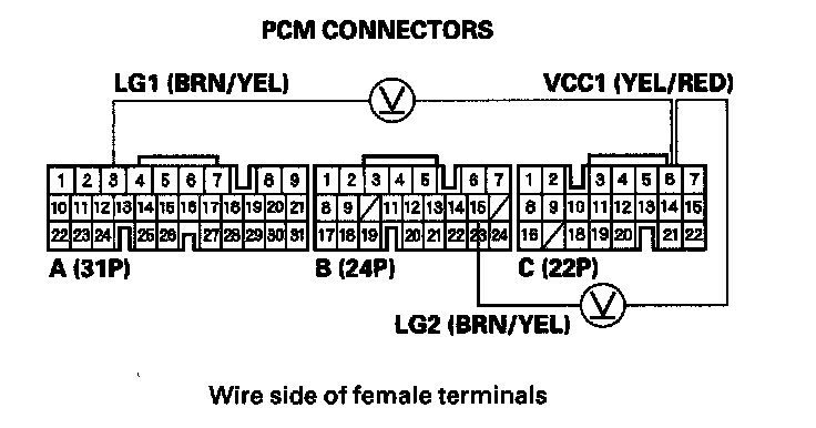 23. Measure the voltage between PCM connector terminals B19 and A3 or B15.