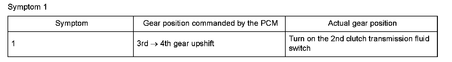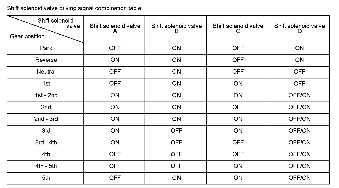 Shift solenoid valve D is installed in the transmission housing. It is controlled by the ON/OFF signal from the powertrain control module (PCM) to apply line pressure to lock-up shift valve. The signal from the PCM is output to apply clutch pressure control pressure to the proper gear change clutch according to the gear change schedule. When the signal to shift solenoid valve D from the PCM is ON, and line pressure is applied to the lock-up shift valve, it operates against the lock-up shift valve spring. When the signal to shift solenoid valve D from the PCM is OFF, and line pressure is discharged, the lock-up shift valve is inactive. The PCM monitors the input shaft (mainshaft) speed and the output shaft (countershaft) speed at the gear change determined by the shift schedule. When an improper gear ratio is output compared to the predetermined gear change mode, a shift solenoid valve D OFF failure is detected and a DTC is stored.