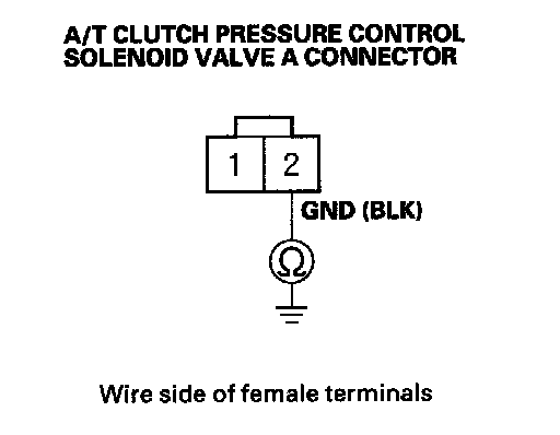 8. Measure the resistance between A/T clutch pressure control solenoid valve A connector terminals No. 1 and No. 2.