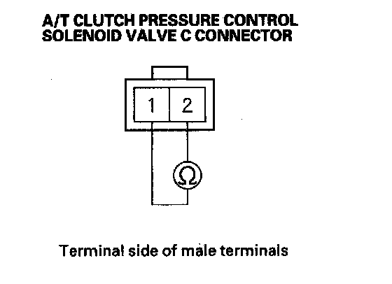 8. Measure the resistance between A/T clutch pressure control solenoid valve C connector terminals No. 1 and No. 2.