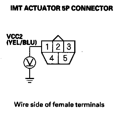 10. Measure voltage between IMT actuator 5P connector terminal No. 3 and body ground.