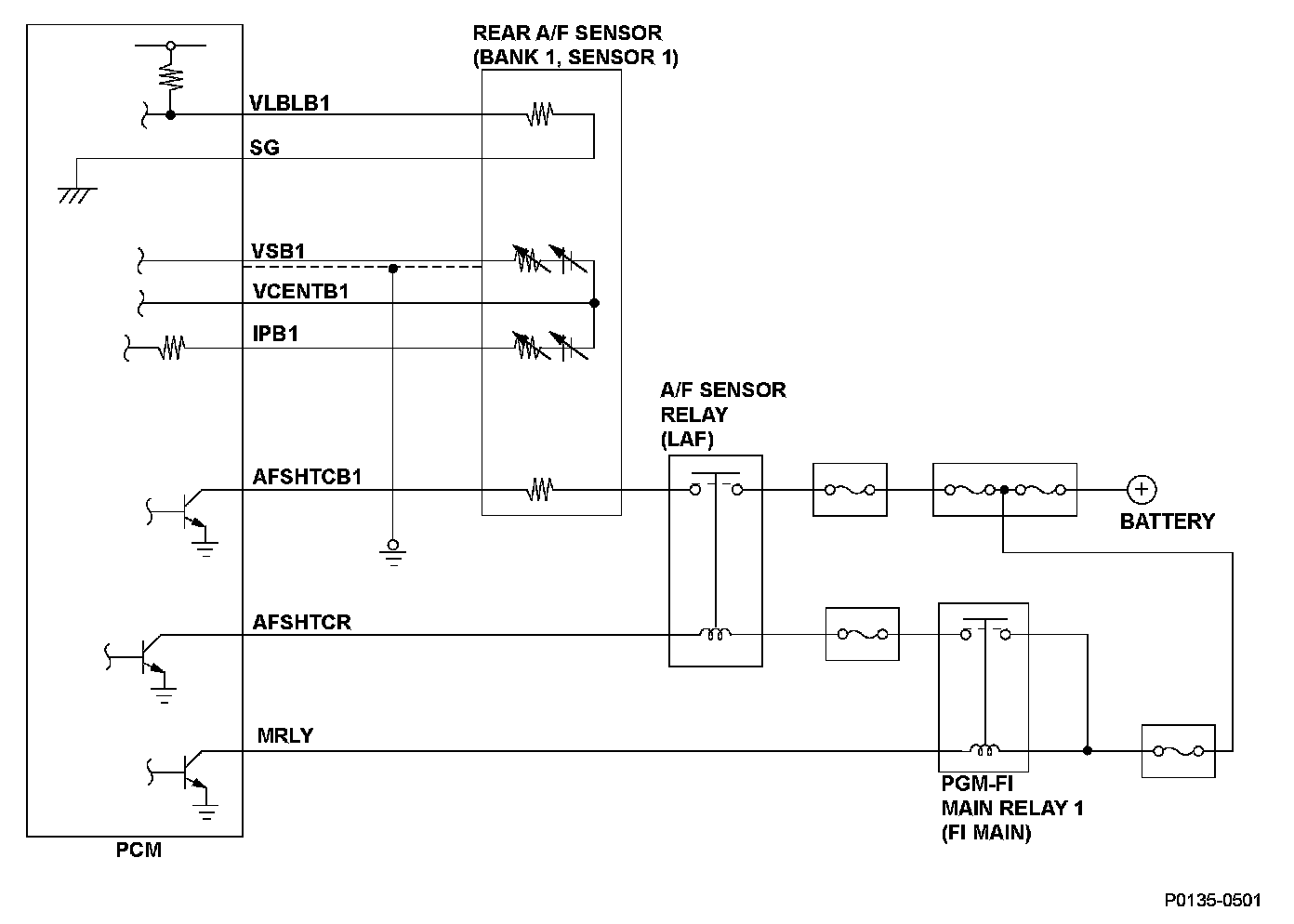 The rear A/F sensor (bank 1, sensor 1) has a built-in LABEL resistance to regulate the difference of the sensor characteristics. The PCM reads the resistance to regulate the difference properly. If the LABEL resistance (VLBLB1 signal voltage) is a set value or less, the PCM detects a malfunction and stores a DTC.