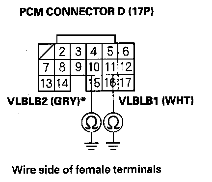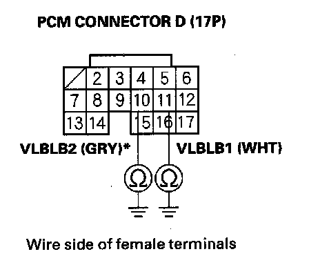 8. Check for continuity between PCM connector terminal D11 (D10)* and body ground.