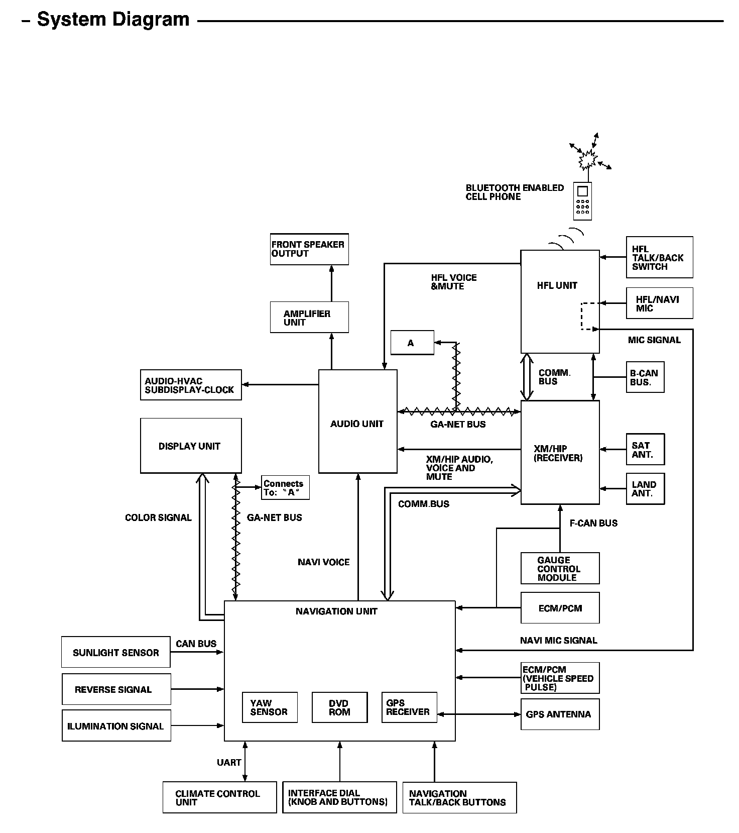 The GA-Net bus is basically an audio bus. The GA-Net bus connects the navigation control unit, display panel control unit, audio unit, XM unit, and HFL unit. Data passed on this bus includes manual audio control functions, like XM station selection, audio voice commands from the driver, and the muting signal from the navigation unit.