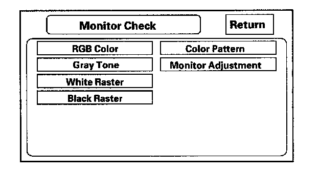 This screen verifies that the display unit is receiving the video (R, G, B and Composite sync) signals properly. The three primary colors should all be shown without distortion. The combination of all three should produce a central white section. If any of the colors are missing, troubleshoot for the color signal. If the picture has lines in it or scrolls horizontally, or vertically, troubleshoot for a Composite sync problem.