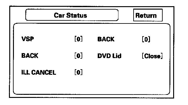 Use this screen to confirm that the navigation unit is properly receiving input signals. Signals equal to (0) are OFF, and signals equal to (1) are ON. If the value on the display does not match the actual vehicle status, then check the wire carrying the signal.