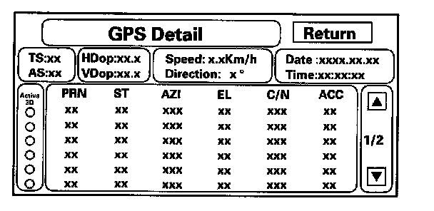 By pressing and holding the MENU button for 10 seconds, a GPS Detail screen appears. This screen displays real time incoming satellite positional data when the vehicle is outside in the open. The information shown on this screen is for factory use.