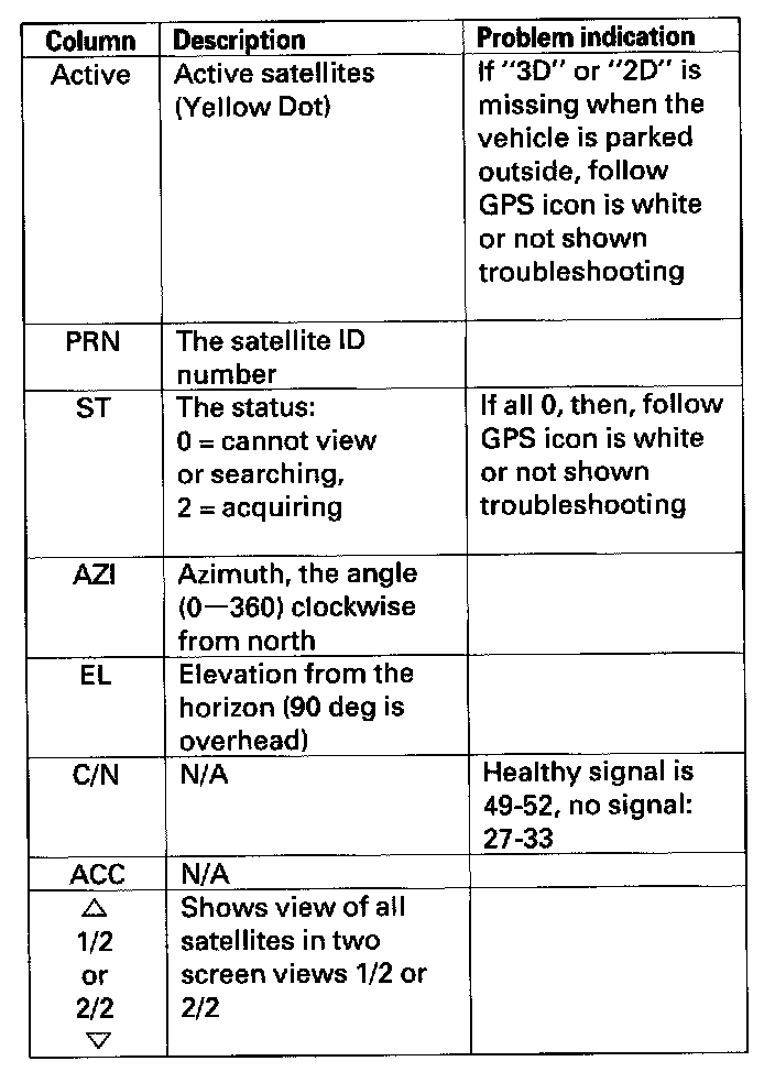 NOTE: To use this screen for troubleshooting, the vehicle should be out side away from buildings, tall trees, and high-tension wires for at least 10 minutes with the engine running.