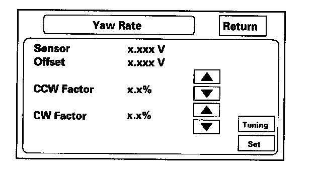 2. Road test: Drive the vehicle on a very straight road. Enter the diagnostic mode, select "Yaw rate," and touch the "Tuning" button. While driving down a straight road, the white "dots" should trace a straight line across the screen. However, if you are driving on a straight road, and you notice the dots constantly dropping down or heading up as you drive, the navigation control unit's yaw sensor is defective. You can touch "Reset" to clear "ANG-Disp," and dotted lines.