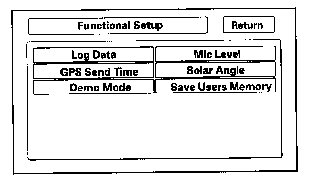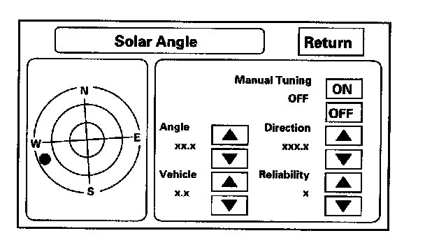 This screen graphically displays the sun's position as determined by the GPS. The navigation system uses the sun's angle, along with the sunlight sensor to control the driver/passenger A/C air flow. The heat that the A/C unit removes varies, depending on the angle of the sun entering the vehicle. This screen is for factory use only, and should not be adjusted.