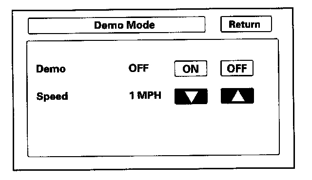 This screen is for factory use only, and should always be set to "OFF." Occasionally "DEMO" setting is turned "ON" when vehicles are being used at Auto Shows or similar events. Turning this feature on, allows the navigation system to automatically follow a route to destination when the vehicle is stationary. The "Speed" can change the speed of the demo mode.