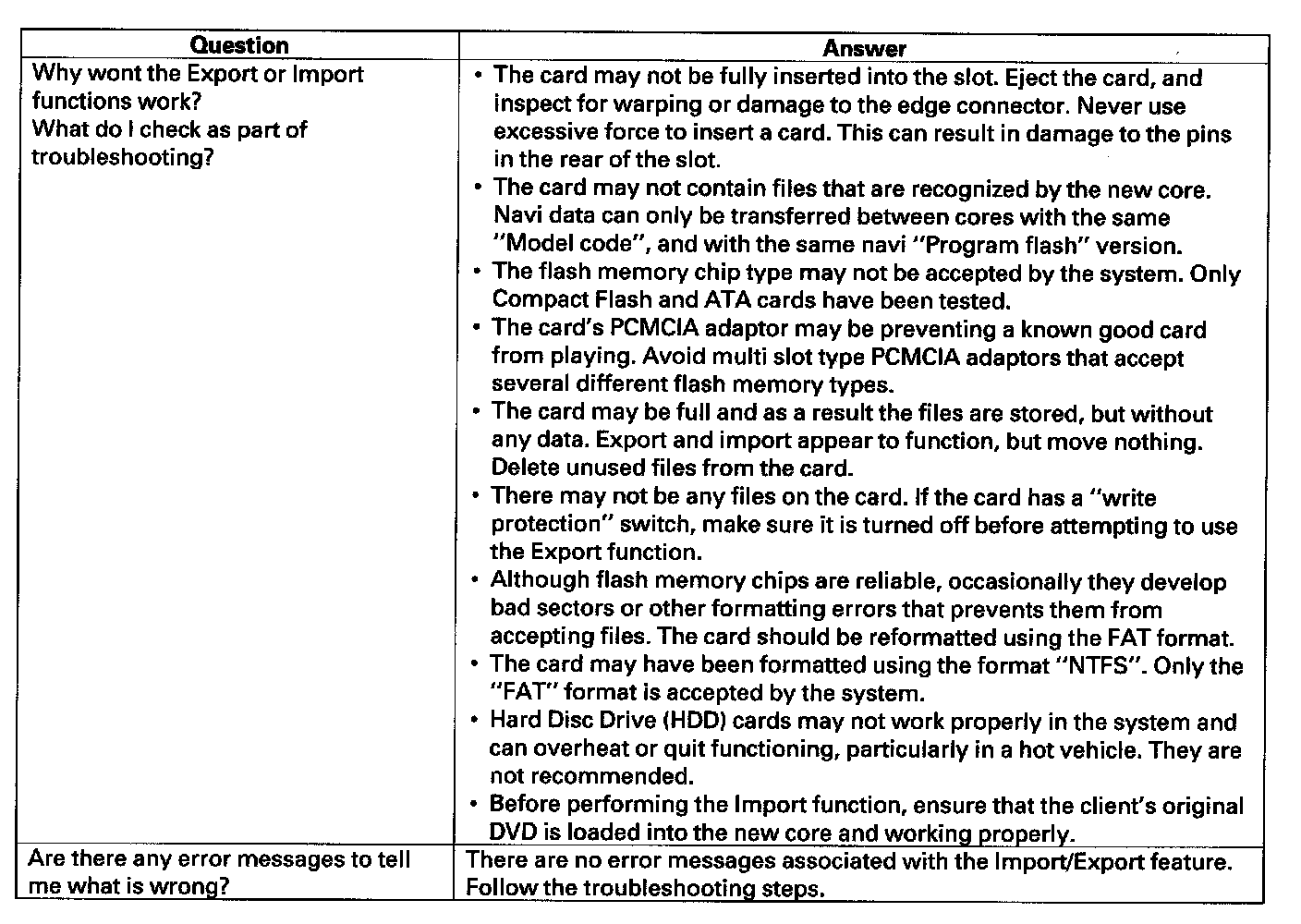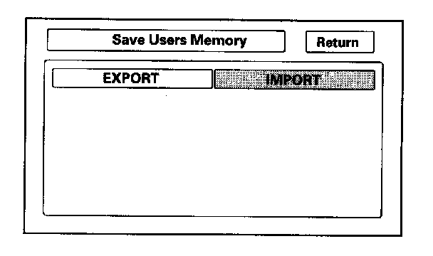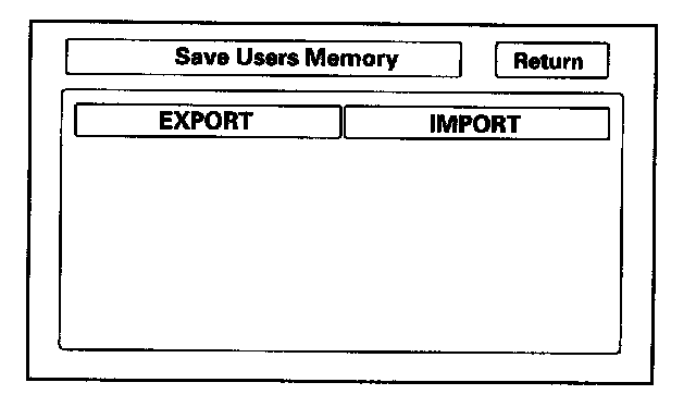 This is similar to saving and entering the client's audio presets when replacing an audio core. The transferred information includes their Setup settings, and personal addresses. The dealer inserts a PC card (like the PC card in the HDS), and then selects the "Save users Memory" function. The two functions in this diagnostic screen are Export and Import. Export saves the client's data to the PC card, and Import moves the PC card files to the new core.