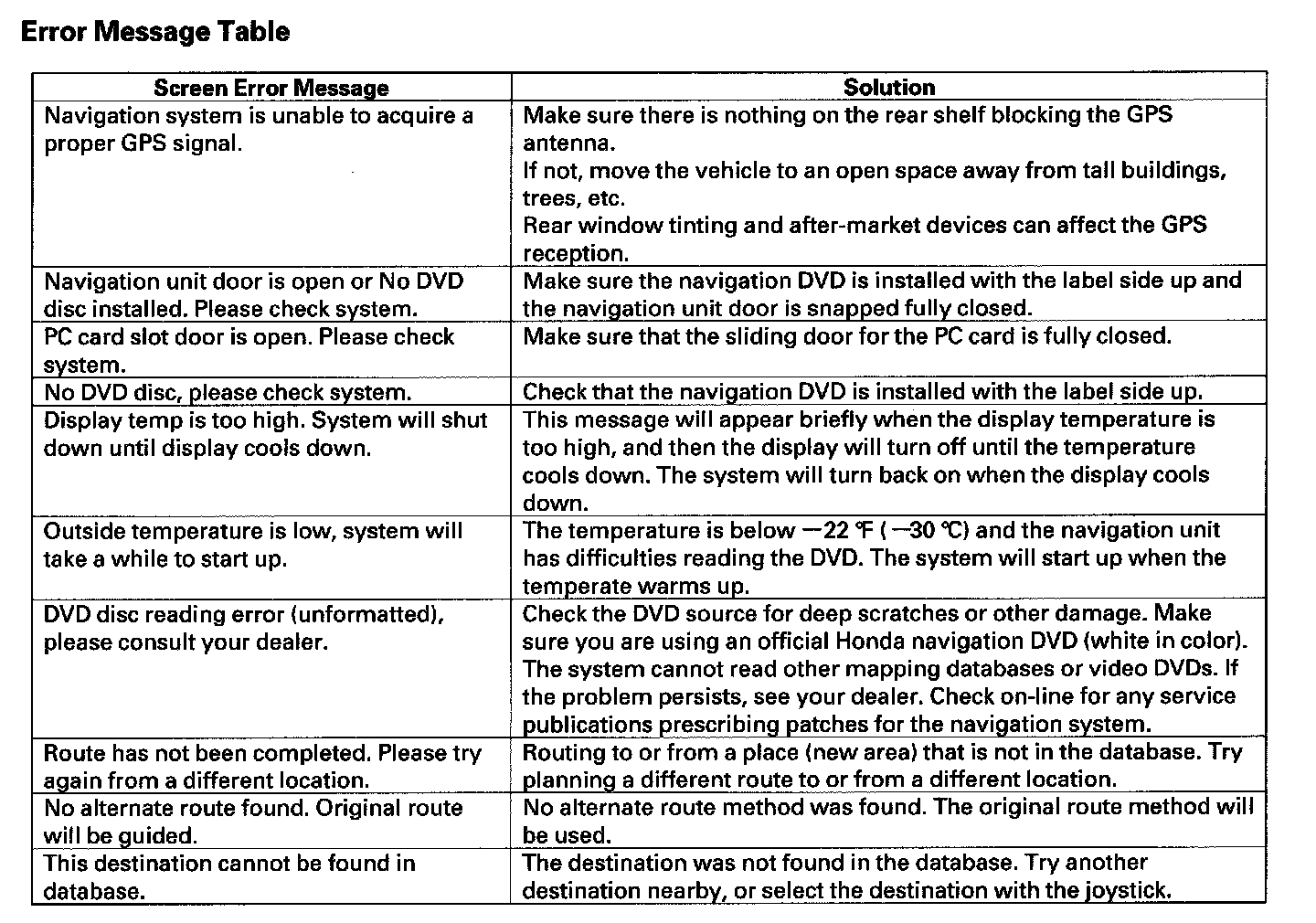 Error Message Table