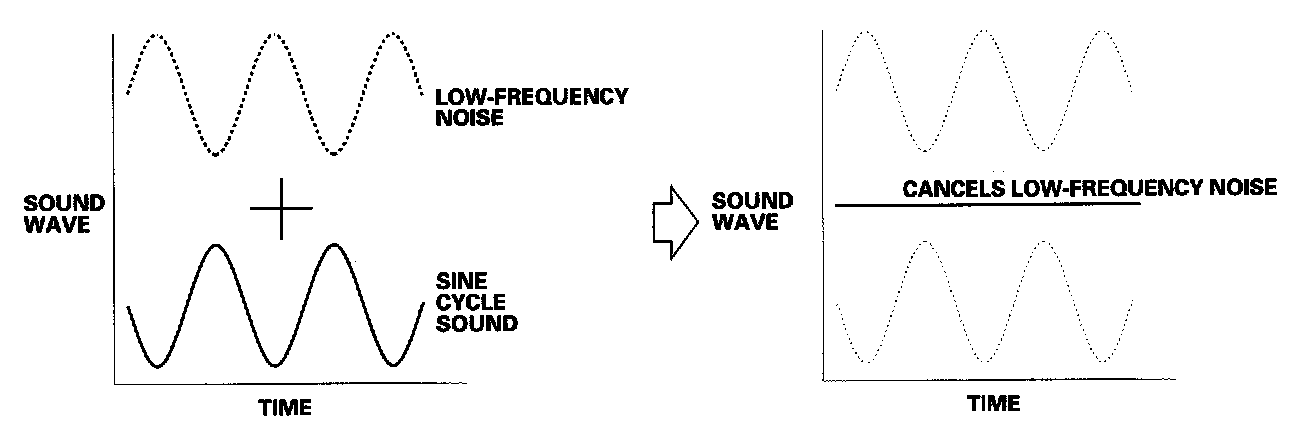 The system includes an active noise control system to cancel some of the vehicle noise. It use a sine-wave-shaped sound output to cancel low frequency noise. Two microphones detect the low frequency sound, and the system outputs a canceling sound through the audio speakers.