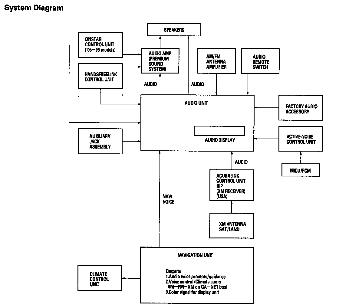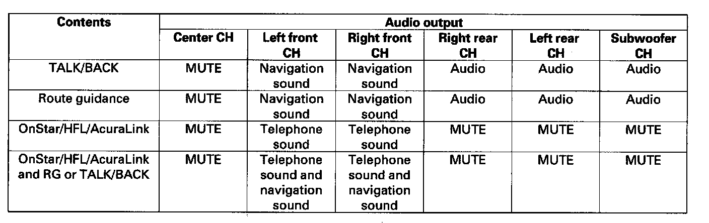 The optional navigation system provides voice control for front/rear audio, XM, and CD player. Voice control commands are communicated on the GA-Net (audio unit). When using the TALK/BACK or route guidance (RG), only the center speaker is muted and the front speakers give the navigation instructions. When using OnStar/HFL/AcuraLink, the center speaker, the rear speakers, and the subwoofer are muted and the front speakers give the telephone sound. When using OnStar/HFL/AcuraLink and RG or TALK/BACK, the center speaker, the rear speakers, and the subwoofer are muted and the front speakers give the telephone sound and the navigation instructions. Muting commands are passed on the GA-Net bus. For more information, see the navigation system. The outline of the audio interruption function is shown in the following table.