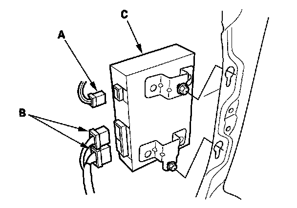 2. Disconnect the antenna 2P connector (A) and 20P, 16P connectors (B) from the AcuraLink control unit (XM receiver) (C).