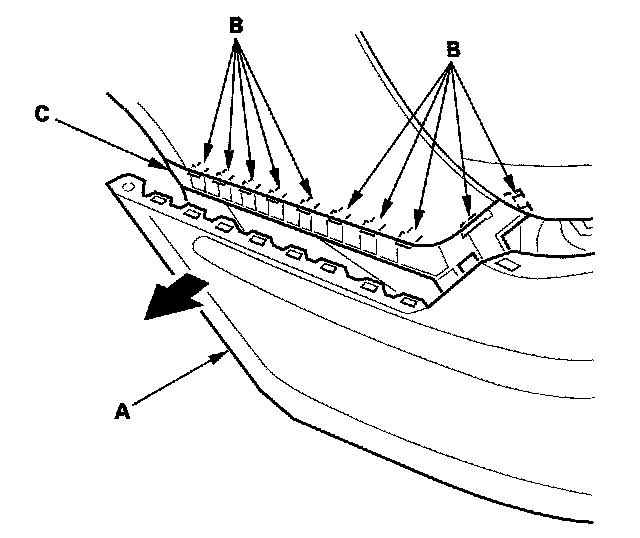 4. With the help of an assistant, pull the rear bumper (A) to release the bumper from the hooks (B) on both upper brackets (C).