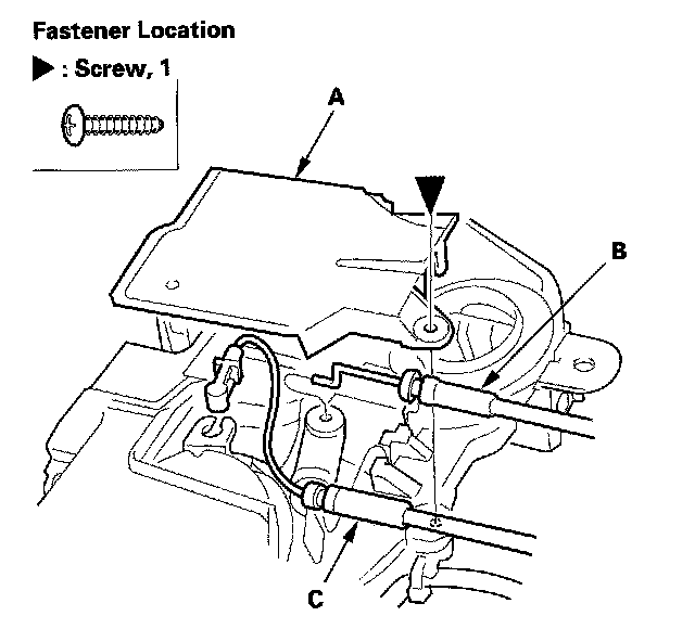 8. Remove the screw, and remove the latch protector (A), then disconnect the latch cable (B) and inner handle cable (C).