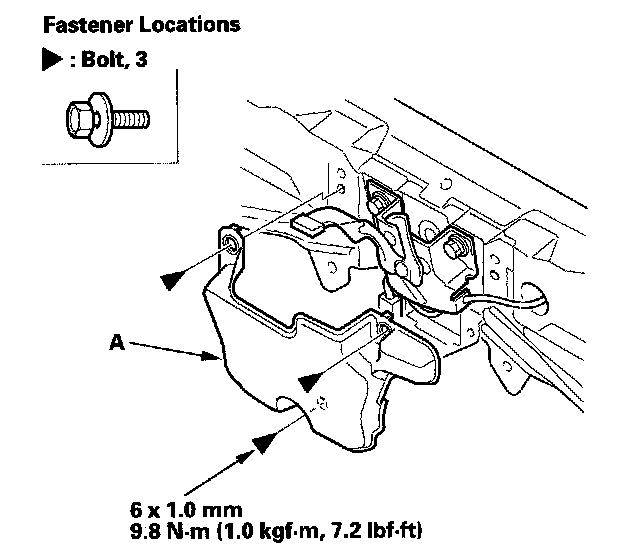4. Remove the bolts, then remove the hood latch (A) from the body.