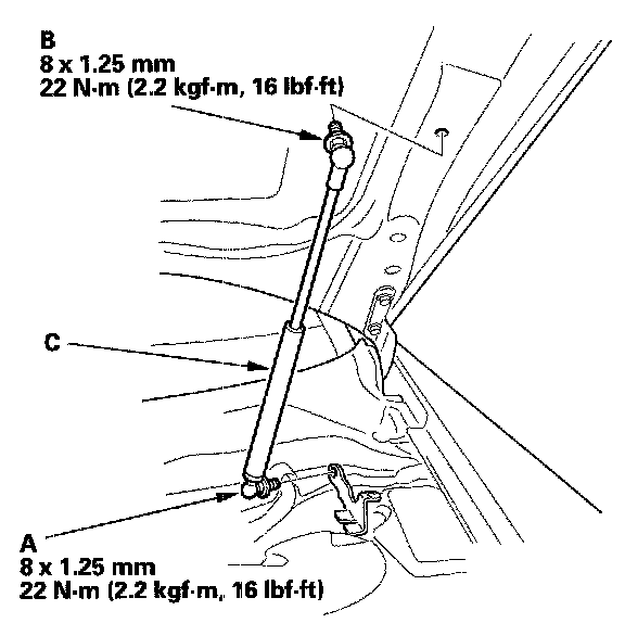 2. Remove the pivot bolt (B) from the hood, then remove the support strut (C).