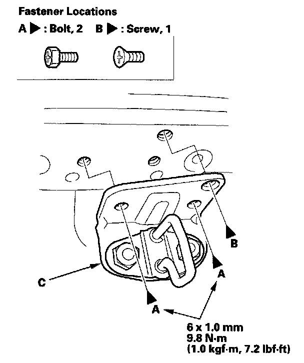 2. Remove the screw (B), then remove the trunk lid striker (C).