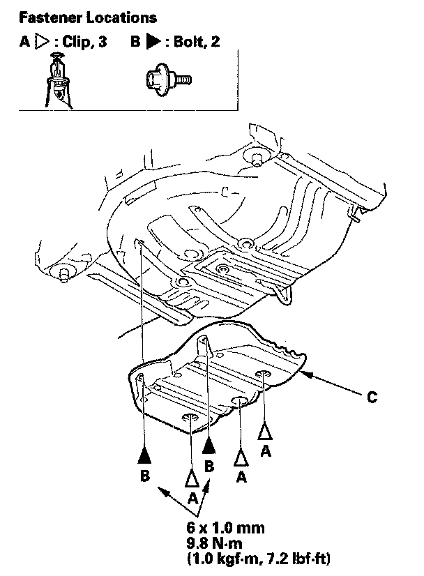 1. Remove the clips (A) and bolts (B), then remove the rear undercarriage cover (C). Take care not to scratch the rear bumper.