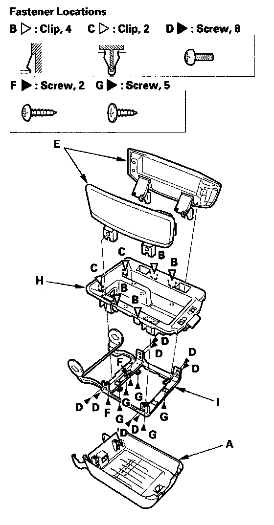 3. Remove the screws (F,G), then remove the armrest tray (H) from the armrest bracket (I).