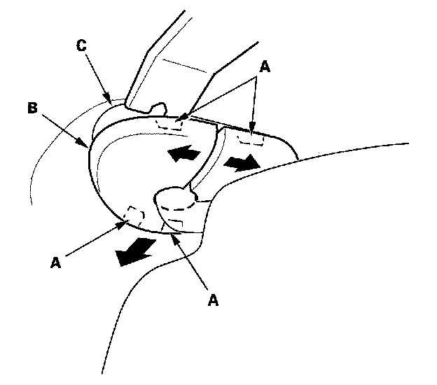 2. From both sides, using a trim tool, release the tabs (A), then turn the sunvisor cap (B), and remove it from the bracket (C).