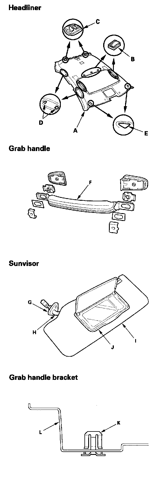 - Any fasteners (B) or clip bases (C) which have come off the headliner