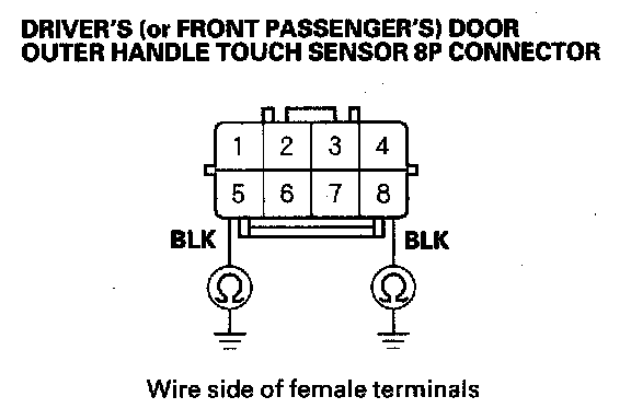 12. Connect the driver's (or front passenger's)' door outer handle touch sensor 8P connector No. 2 and No. 6 terminals to body ground with jumper wires.
