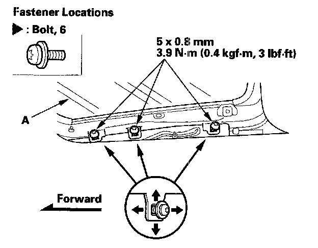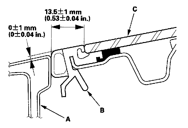 Glass Position AdjustmentThe roof panel (A) should be even with the glass weatherstrip (B), to within 0-1/-1 mm (0+0.04/-0.04 in.) all the way around, and to within 13.5+1/-1 mm (0.53+0.04/-0.04 in.) between the roof panel and the front edge of the glass (C). If not, make the following adjustment: