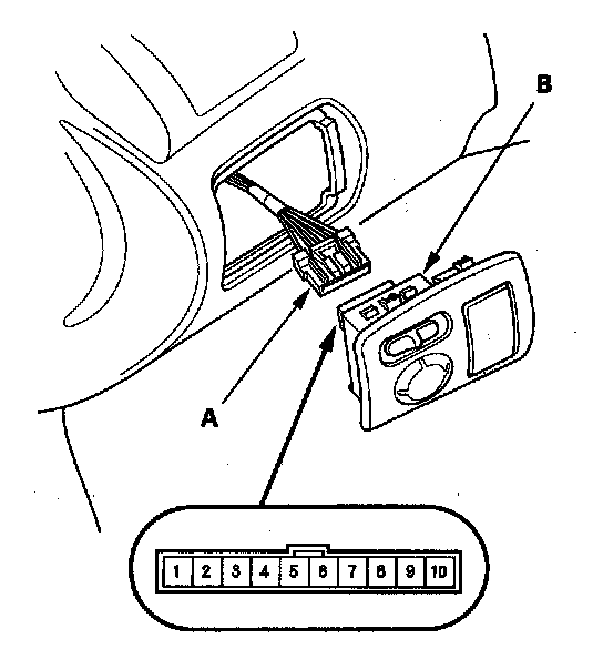 2. Disconnect the 10P connector (A) from the power mirror switch (B).