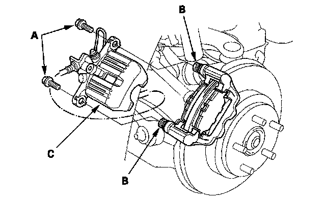 5. Remove the caliper bracket mounting bolts (A) while holding the caliper pins (B) with a wrench being careful not to damage the pin boot, and remove the caliper (C). Check the hose and pin boots for damage and deterioration. Thoroughly clean the outside of the caliper to prevent dust and dirt from entering inside. Support the caliper with a piece of wire so it does not hang from the brake hose.