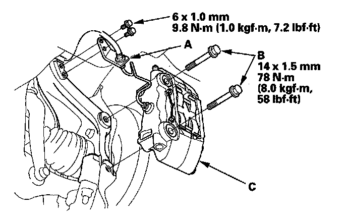 4. Remove the brake caliper bracket mounting bolts (B), and remove the caliper assembly (C) from the knuckle. To prevent damage to the caliper assembly or brake hose, use a short piece of wire to hang the caliper assembly from the undercarriage. Do not twist the brake hose with force.