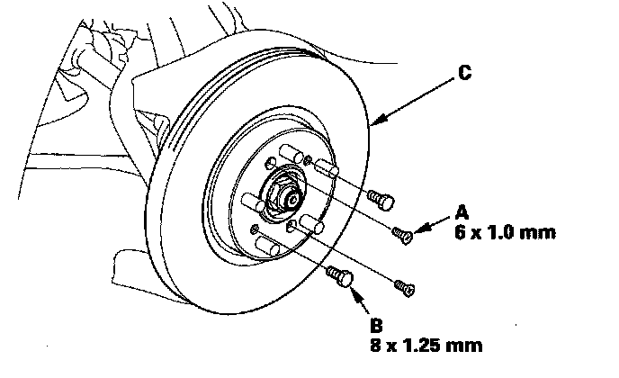 6. Thread two 8 x 1.25 mm bolts (B) into the disc to push it away from the hub. Turn each bolt 90 degrees to prevent the brake disc from binding.
