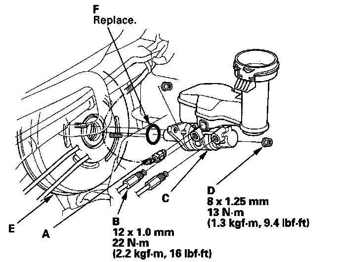 9. Remove the master cylinder from the brake booster (E). Be careful not to bend or damage the brake lines when removing the master cylinder.