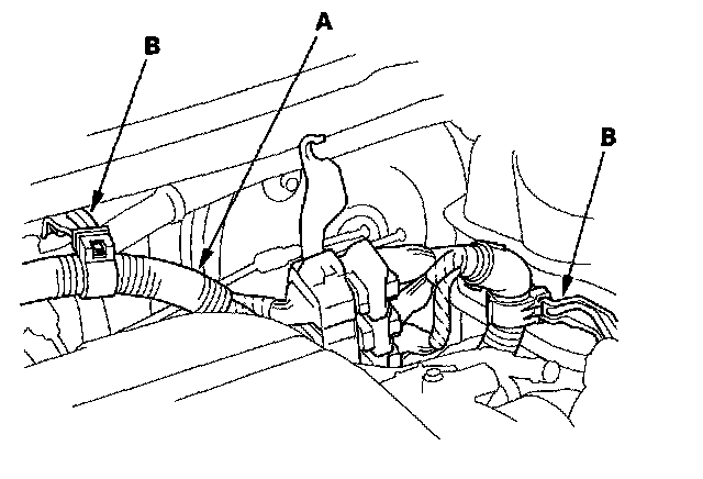 2. Disconnect the vacuum hose (A) from the brake booster (B).