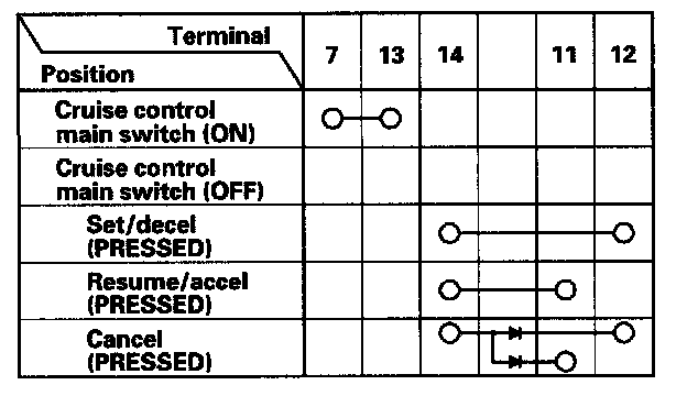 - If there is continuity, and it matches the table, but switch failure occurred on the cruise control input test, check and repair the wire harness on the switch circuit.